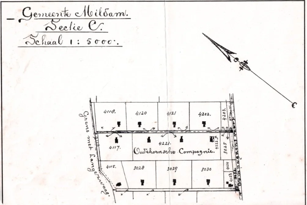 In zomer, najaar 1896 waren aangekocht twee stroken grond, gelegen tussen de Compagnonsvaart en de Singel onder Jubbega-Schurega, gemeente Mildam, te weten het grootste: enige percelen weiland, heide en bos, groot 9 hectare en 9 centiare. Verder (2) bouwvallige huisjes